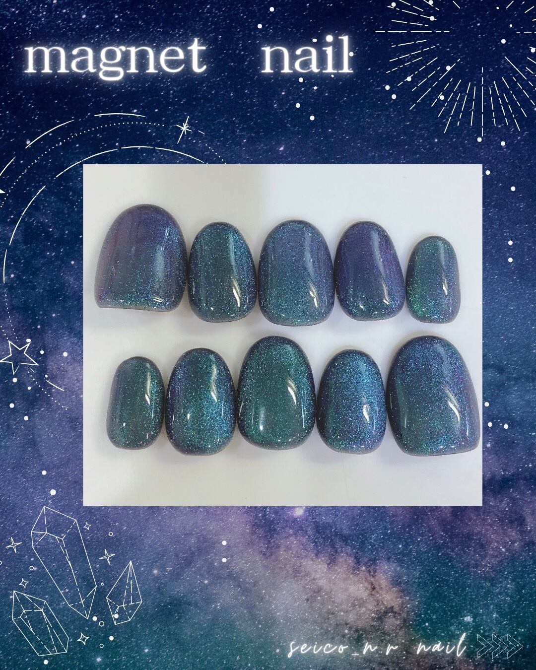 ハンドメイドのマグネットジェルネイル 10本セットです。ミニ爪やすりと強力粘着テープも付属していますので、すぐ使用できます。
