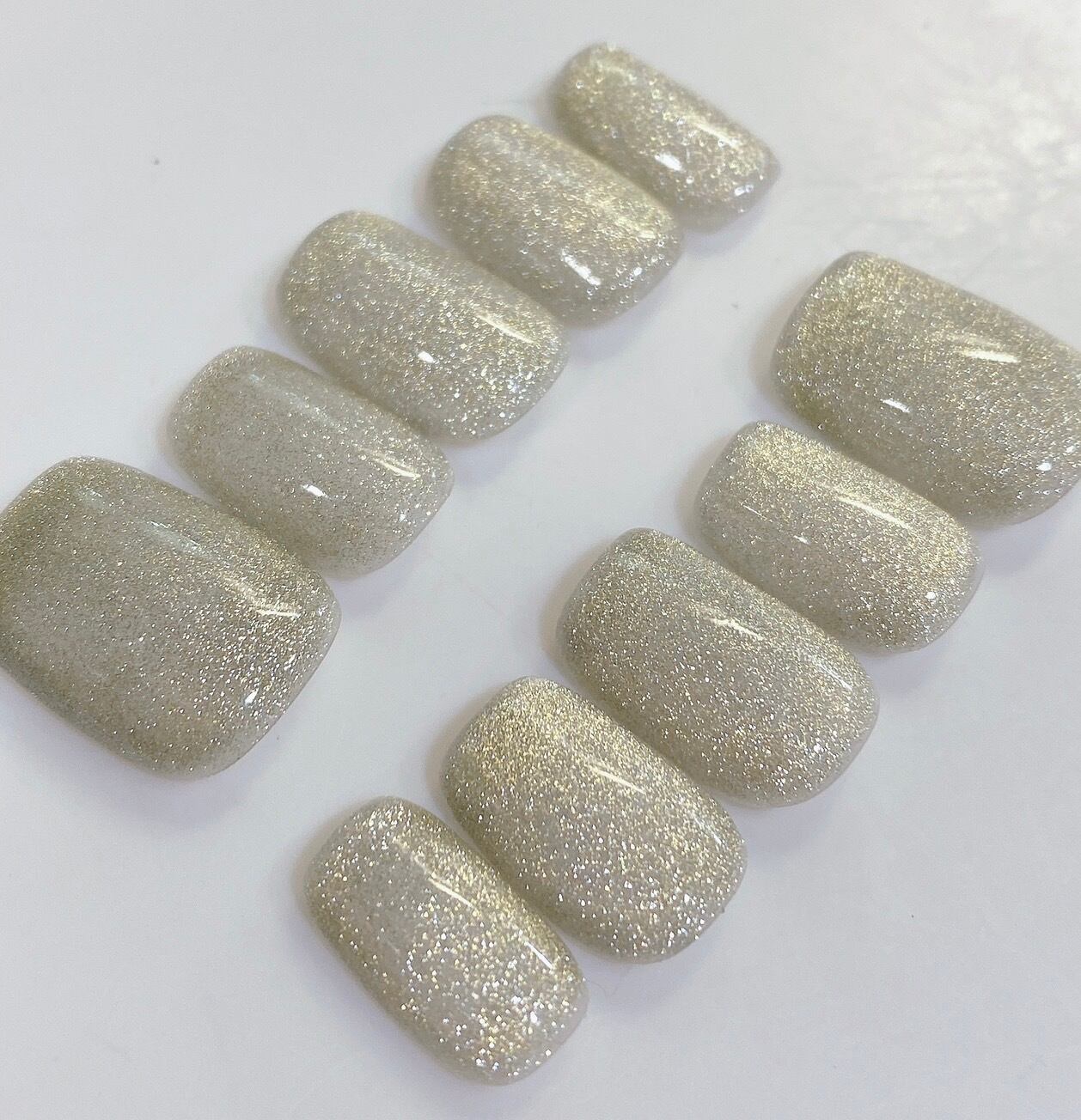 ハンドメイドのマグネットジェルネイル 10本セットです。ミニ爪やすりと強力粘着テープも付属していますので、すぐご使用いただけます。