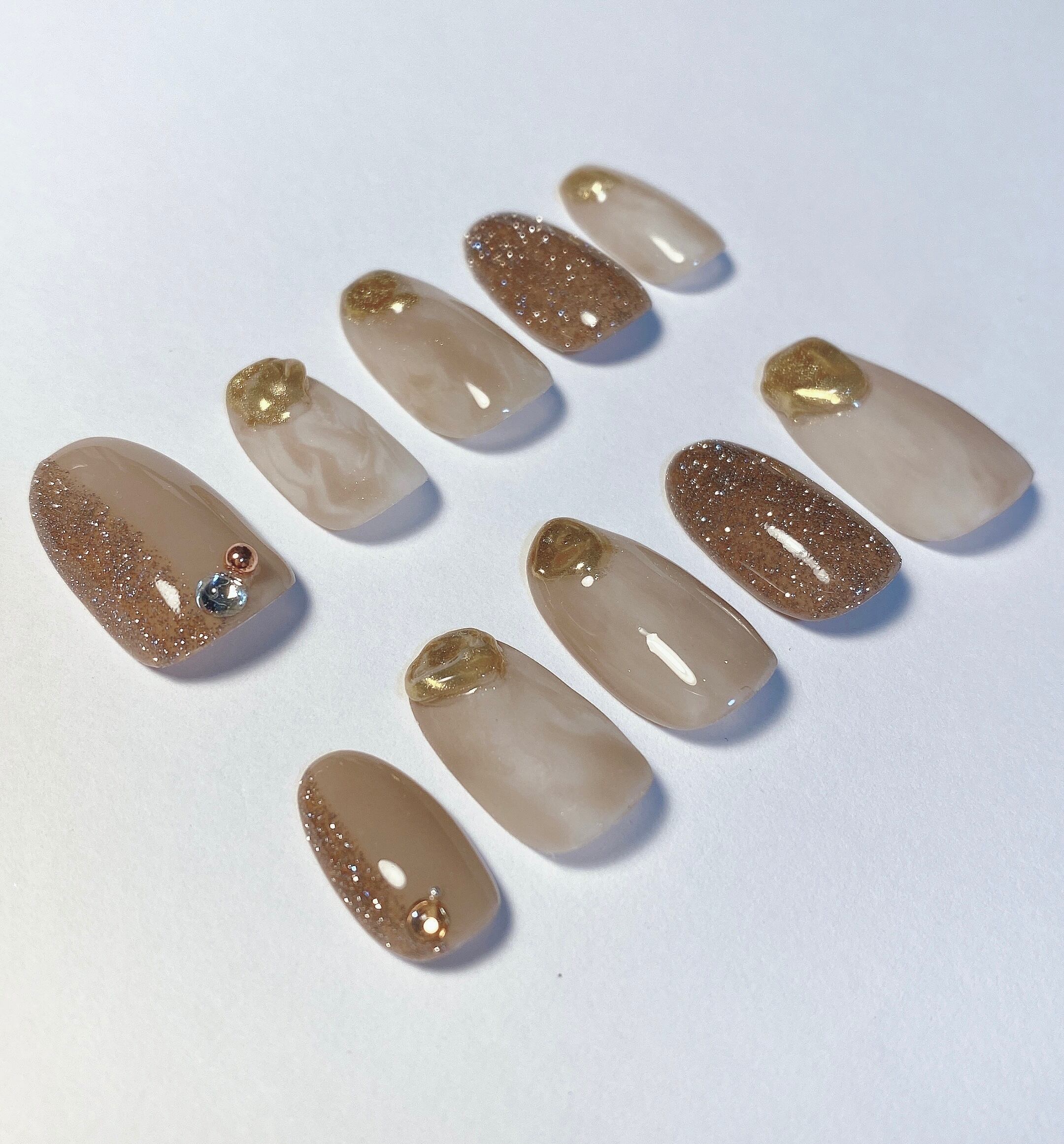 ハンドメイドのニュアンスネイルチップ10本セットです。ミニ爪やすりかとか、強力粘着テープも付属していますので、すぐにご使用頂けます。